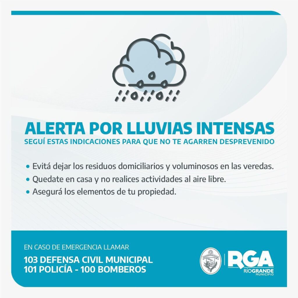Defensa Civil Municipal informa a los y las riograndenses que fue emitida una alerta meteorológica por el Servicio Meteorológico Nacional para este sábado 15 de noviembre.