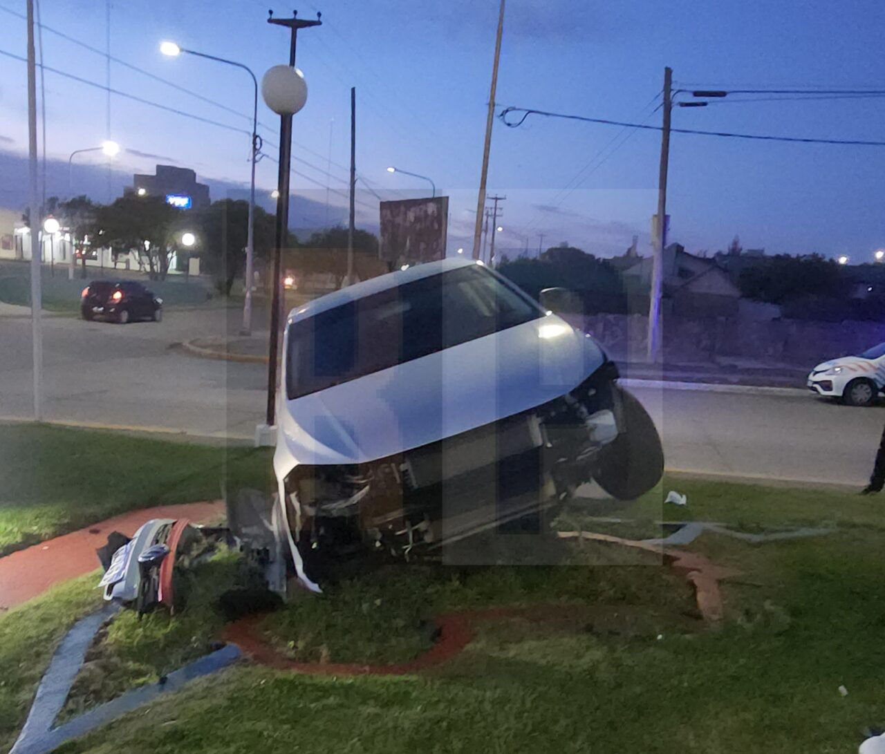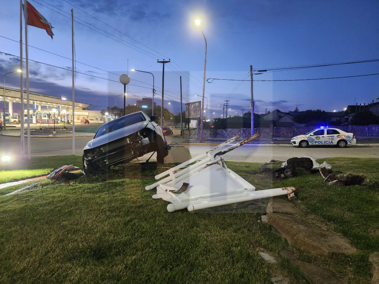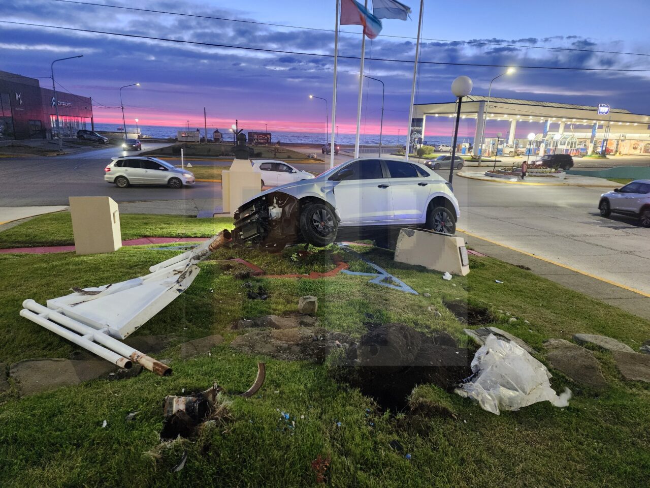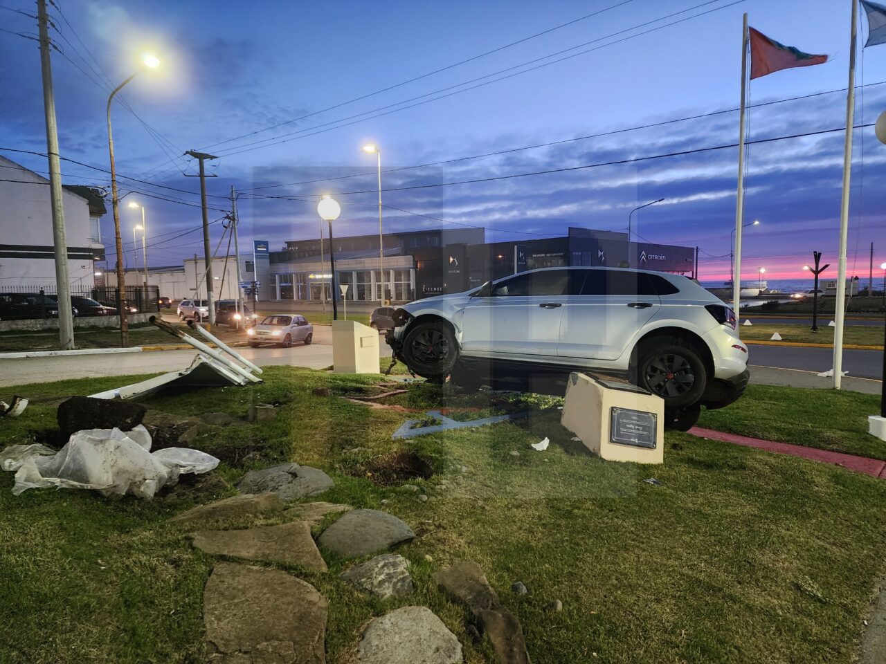 Un vehículo Volkswagen Track era conducido por Claudio González de 38 años quien tomando la bajada perdió el control y se subió al boulevard pasando sobre la forestación para terminar impactando contra la plazoleta y las distintas estructuras de ornamentación.