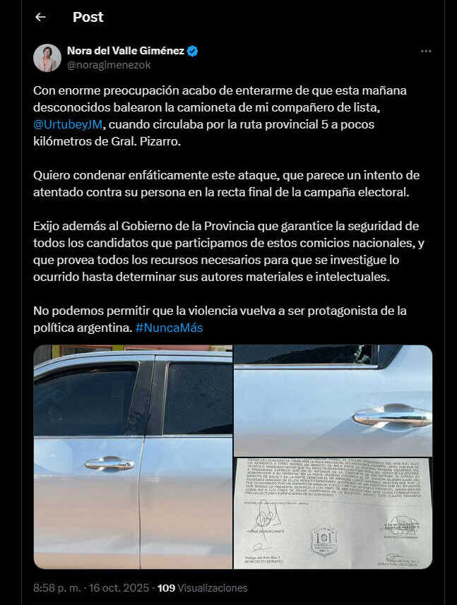 El denunciante aclaró expresamente que el impacto fue ocasionado por un disparo de arma de fuego y que "no se trató de un simple proyectil". Afortunadamente, ninguno de los ocupantes resultó herido.