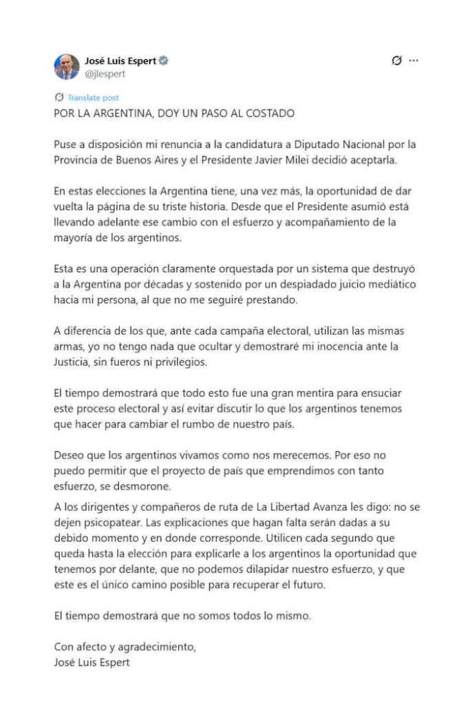 “Esta es una operación claramente orquestada por un sistema que destruyó a la Argentina por décadas y sostenido por un despiadado juicio mediático hacia mi persona, al que no me seguiré prestando”, escribió Espert en sus redes sociales para justificar su renuncia.
