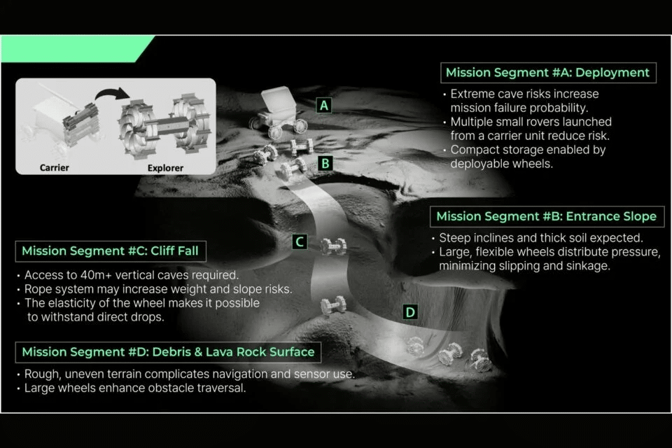Las cuevas lunares se perfilan como el único refugio viable frente a la radiación y las temperaturas extremas. Un equipo surcoreano acaba de presentar un rover diseñado específicamente para explorarlas, con ruedas que se expanden, se comprimen y sobreviven a caídas imposibles.