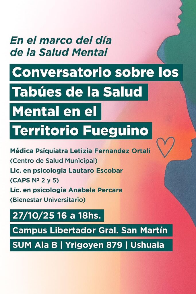 En el marco del Día Mundial de la Salud Mental, la Universidad Nacional de Tierra del Fuego, Antártida e Islas del Atlántico Sur invita a participar del segundo conversatorio “Tabúes de la Salud Mental en el territorio fueguino”, un espacio de reflexión colectiva sobre las representaciones, silencios y desafíos que atraviesan el cuidado de la salud mental en nuestra comunidad.