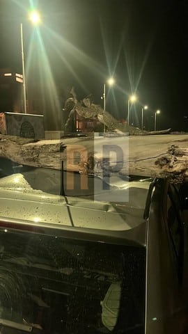 Las fuertes ráfagas de viento provocaron la caída del árbol de gran tamaño, el cual cayó sobre dos vehículos.